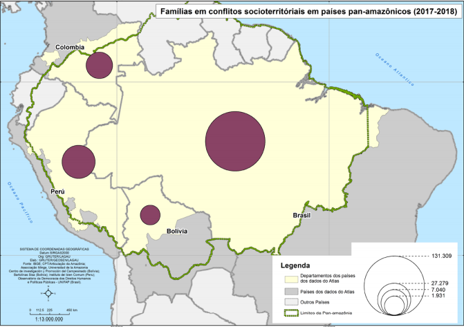 Varias entidades, entre ellas La Comisión Pastoral de la Tierra (CPT) y el Grupo de Investigación y Extensión sobre Tierra y Territorio en la Amazonia (Gruter), presentaron el «atlas de conflictos socioterritoriales» del área de la Panamazonía, con datos de Bolivia, Brasil, Colombia y Perú durante el 2017-2018 .