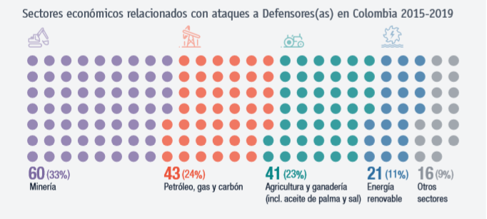 En el 90% de los ataques, los defensores se habían manifestado sobre los efectos negativos de sectores como minería, extracción de hidrocarburos, agronegocios y ganadería, y energía renovable. Por otra parte, «Las empresas que con mayor frecuencia (44% de los ataques) fueron objeto de la defensa de DD.HH. por parte de los defensores y que fueron atacados en respuesta a ella fueron Anglo Gold Ashanti, Big Group Salinas, Cerrejón Coal, Ecopetrol y EPM.