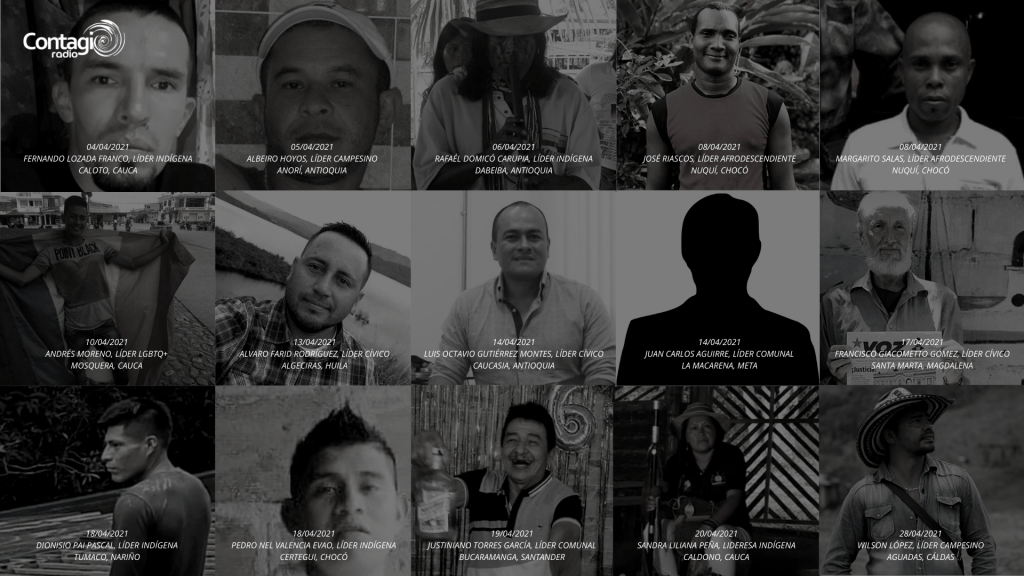 Pese al ensombrecido panorama, CONTAGIO RADIO reafirma su compromiso con la construcción de memoria, hace énfasis en las voz de las víctimas y el Sin Olvido y presenta los rostros de las lideresas y líderes sociales asesinados en este 2021, con la esperanza de mantenerlos en los corazones y en los propósitos de un mejor país.