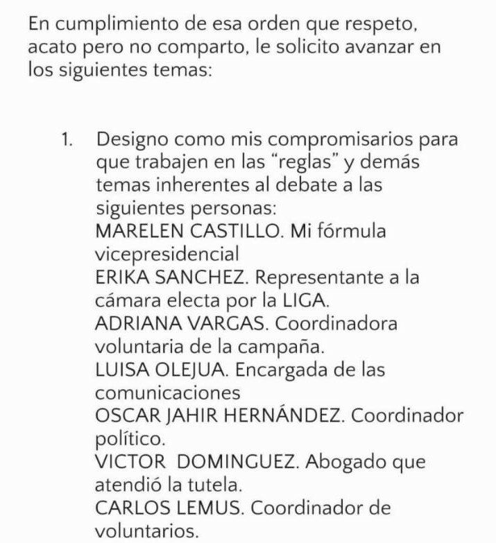 El exalcalde de Bucaramanga, también puso una serie de condiciones, primero, que el encuentro se realice en la capital santandereana, cerca a su casa por “temas de seguridad” y que su formula vicepresidencial, Marelen Castillo, abogados, asesores y equipo de trabajo sean quienes coordinen el espacio con el Sistema de Medios Públicos – RTVC. Dentro de las sugerencias, también se contemplaron determinados moderadores.